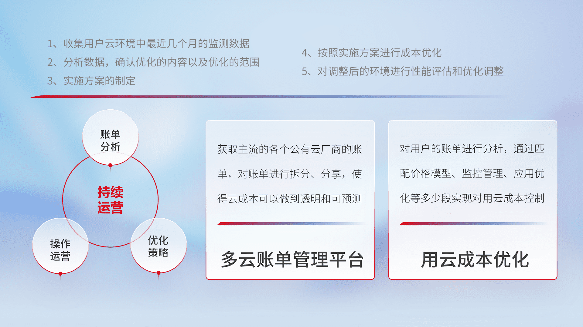 通过多云纳管,,以统一的资源数据模型把客户的云资源进行抽象和封装,,进而实现对多云资源的统一操作,,,保障云资源管理的可靠性、、、稳定性与可用性。。。。量身定制化运维内容,,配置、、开发运维、、、补丁管理、、、、备份、、、、监控、、、认证和访问管理、、、、审计和日常巡检等,,保障在用云过程中的可靠度,,,稳定度以及高可用率。。。。